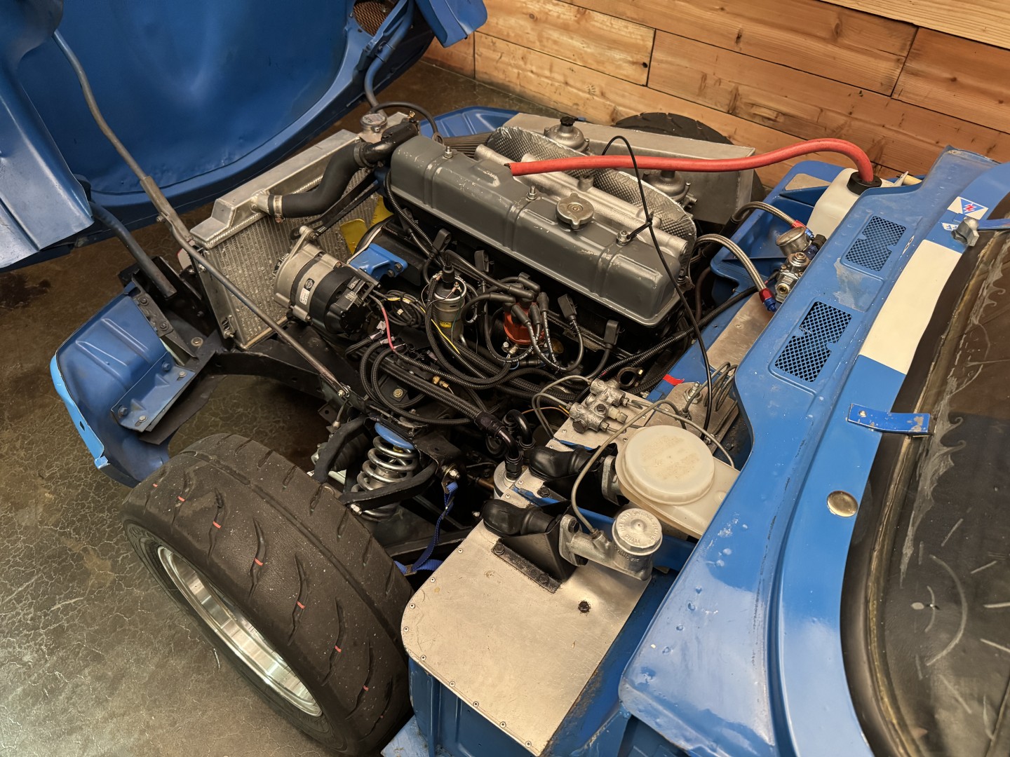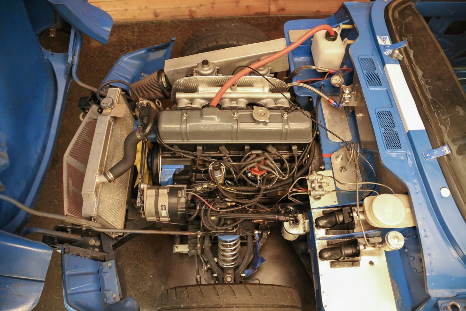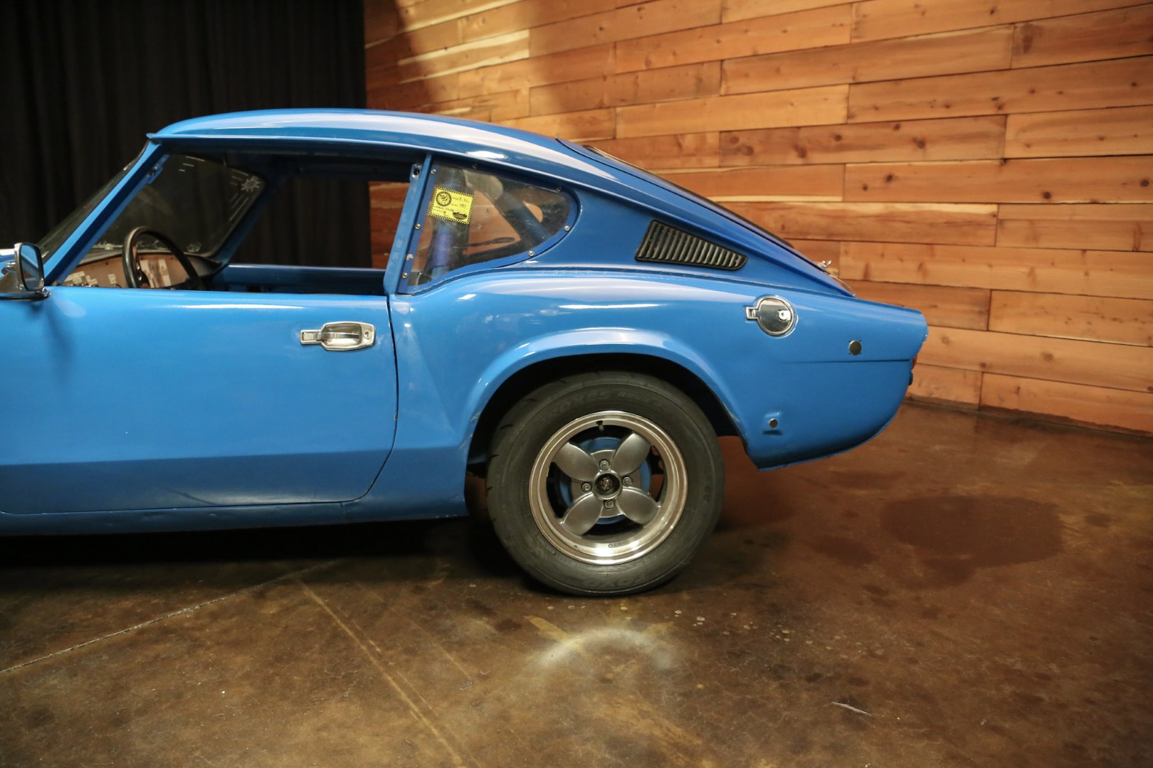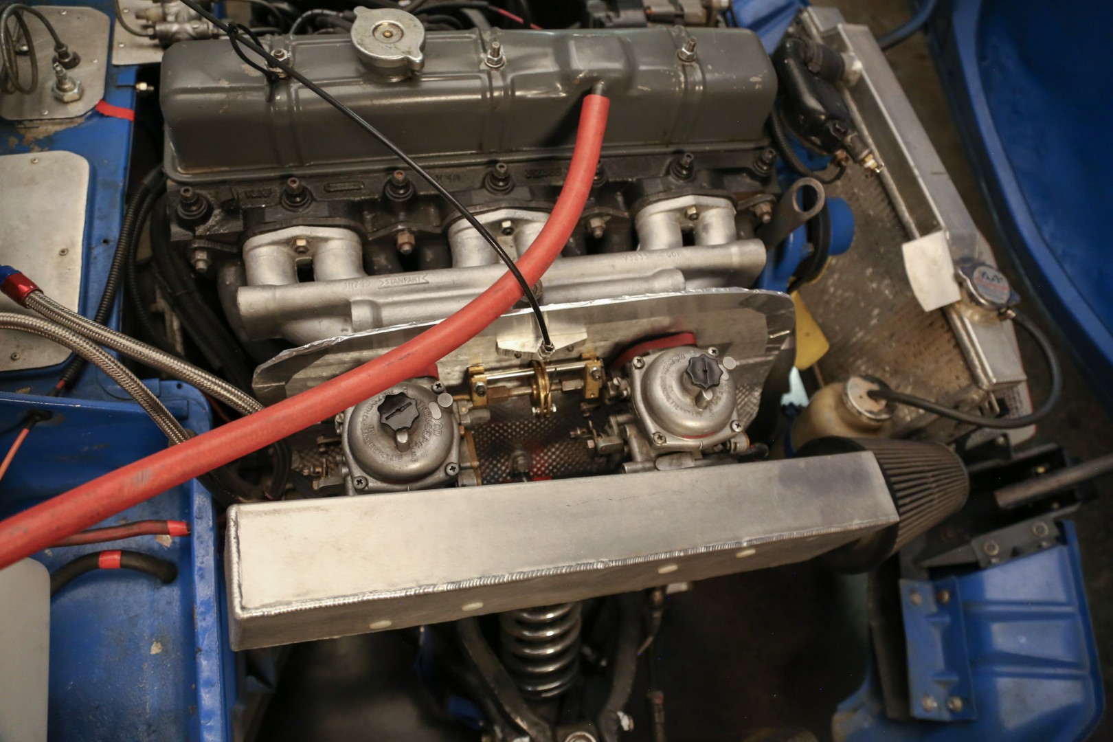 The transmission is a 1973 TR6 unit mated to a hydraulic throw-out bearing, with a clutch bleed nipple conveniently located in the engine compartment. The rear differential runs a 3.89 ratio with solid CV axles and a 1-inch spacer to lower the car. An expensive high-torque starter ensures quick and reliable starts every time. Exhaust exits through custom headers into a single straight pipe, with two new mufflers recently fitted to allow for comfortable street use. Induction is via Stromberg carburetors.