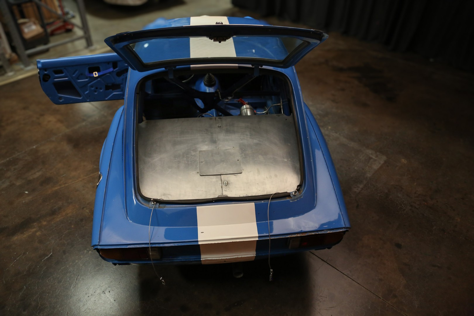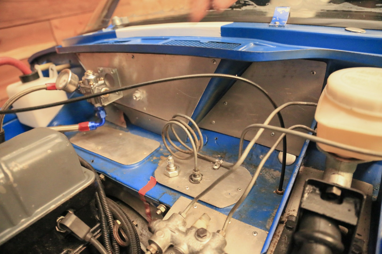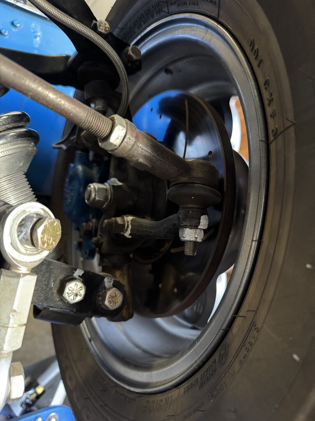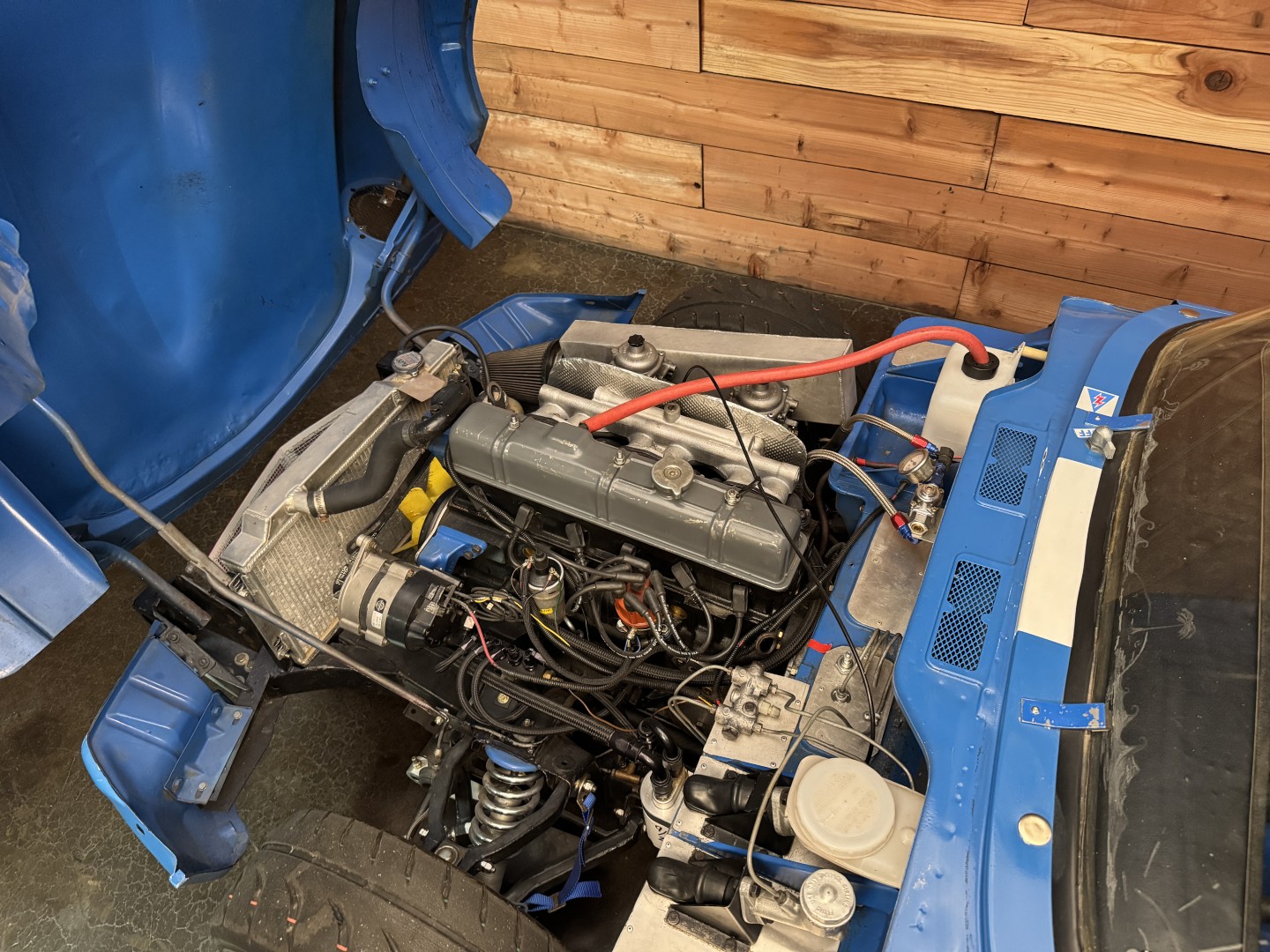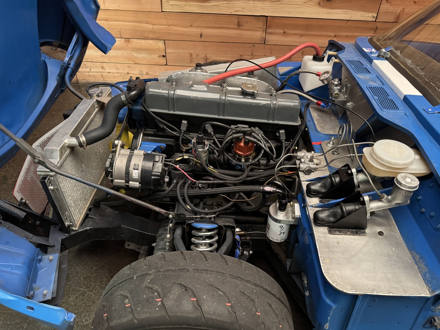 The transmission is a 1973 TR6 unit mated to a hydraulic throw-out bearing, with a clutch bleed nipple conveniently located in the engine compartment. The rear differential runs a 3.89 ratio with solid CV axles and a 1-inch spacer to lower the car. An expensive high-torque starter ensures quick and reliable starts every time. Exhaust exits through custom headers into a single straight pipe, with two new mufflers recently fitted to allow for comfortable street use. Induction is via Stromberg carburetors.