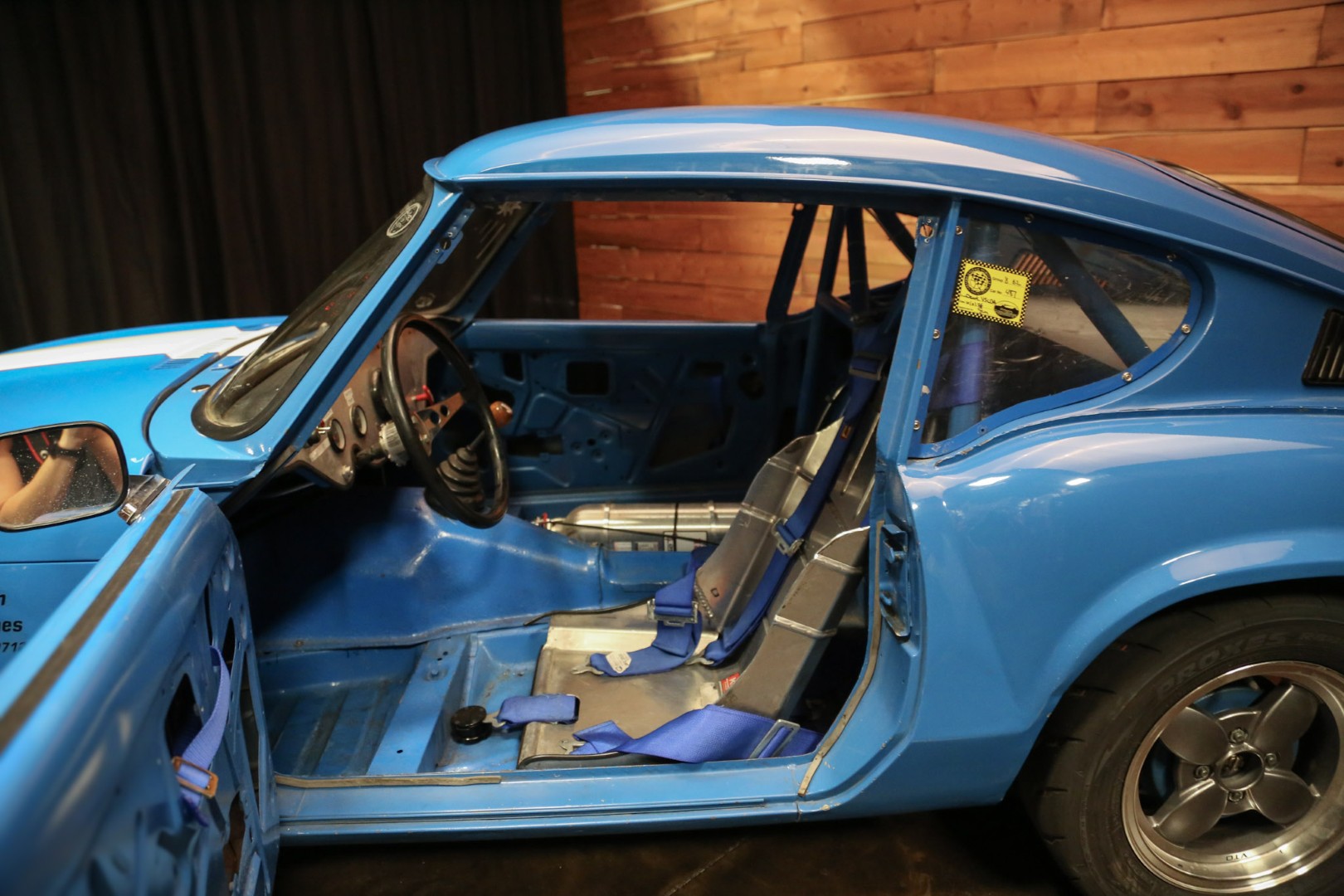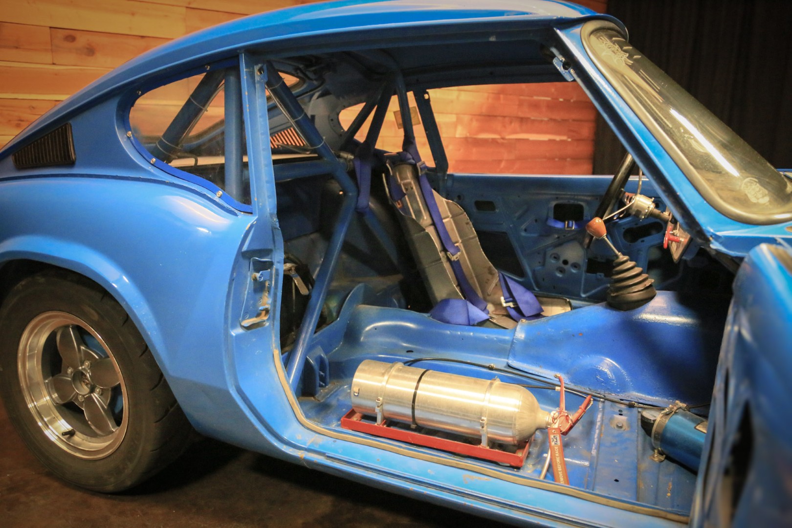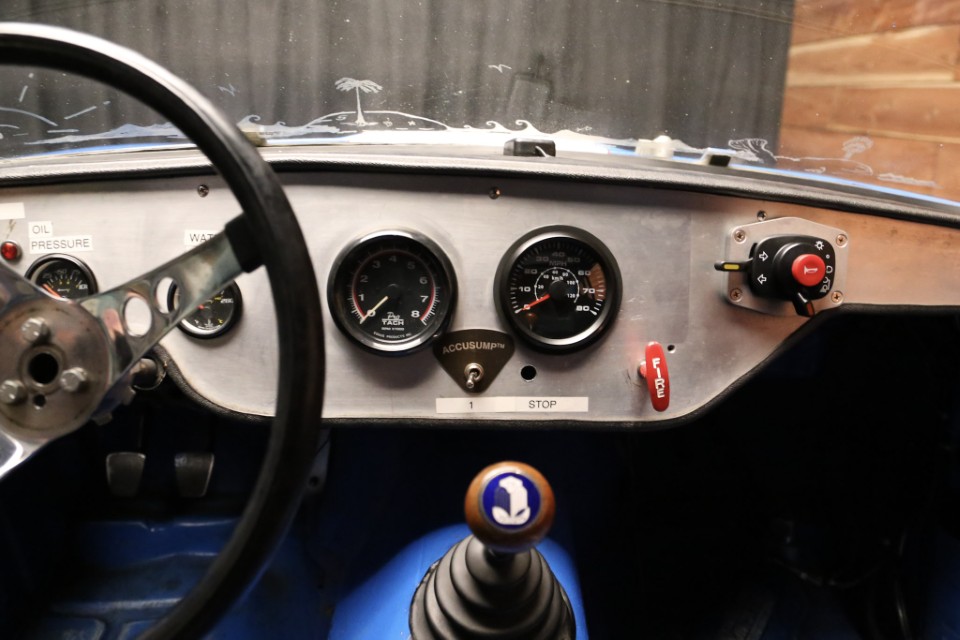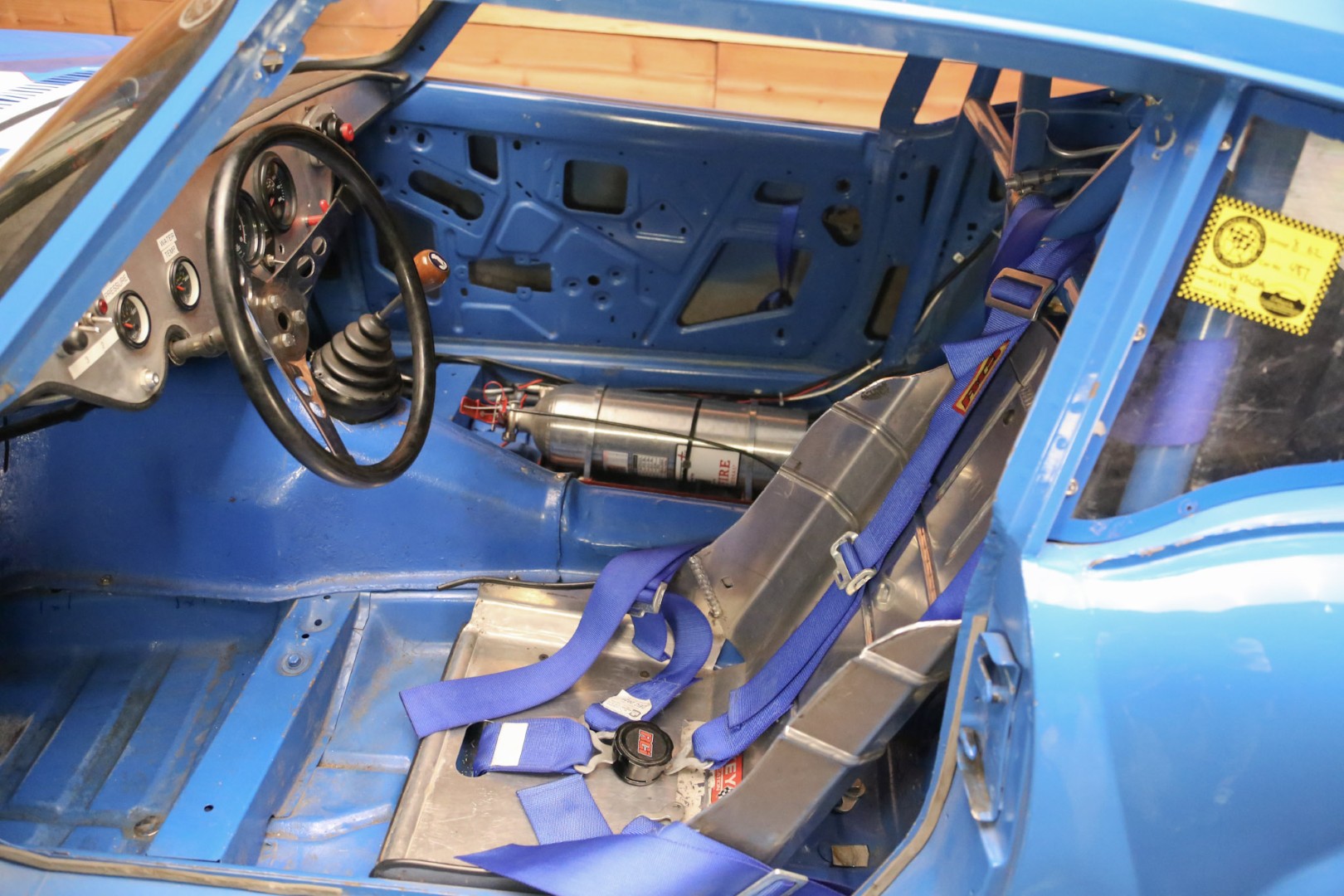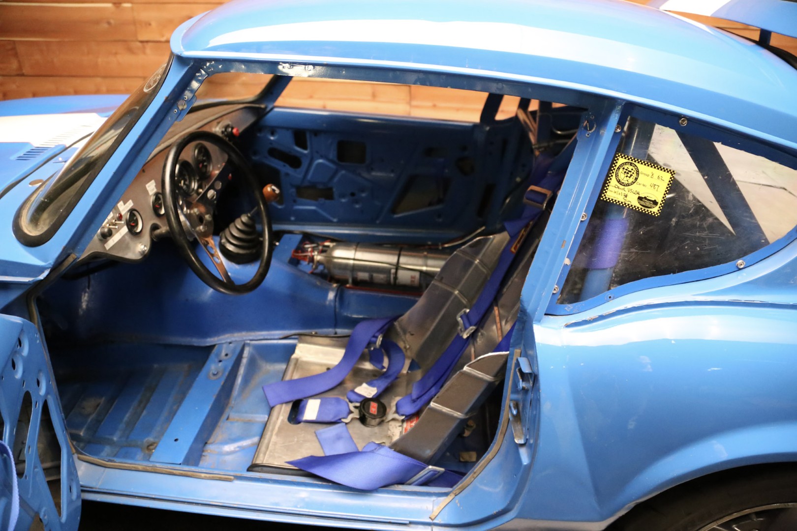 A brand-new fire suppression system is installed, with the suppression tank currently occupying the passenger seating area—this would need relocation if a passenger seat were added. The Accusump system occupies part of the passenger footwell but can also be relocated if desired. Five-point racing harnesses are installed and valid through 2025.