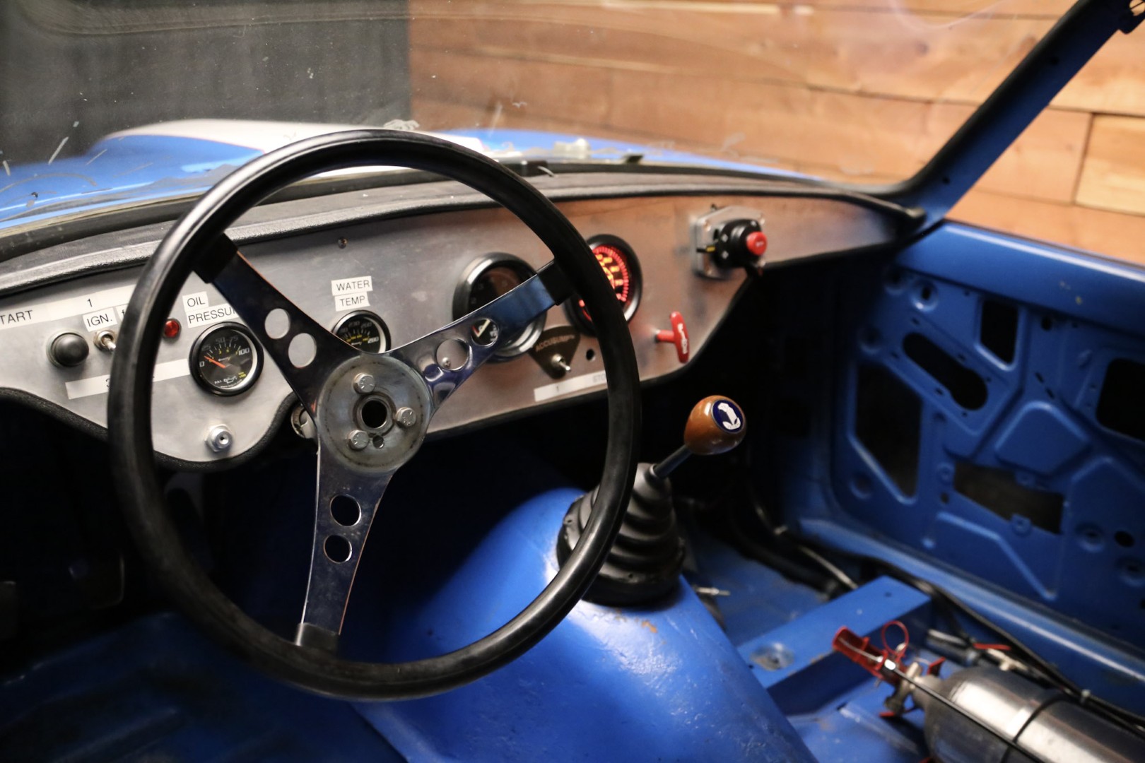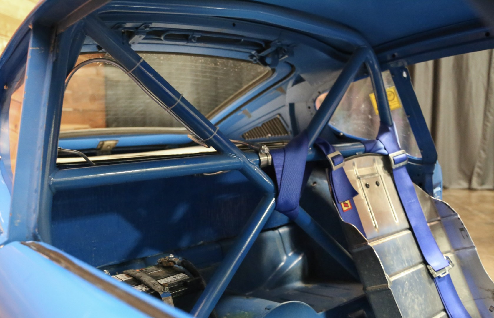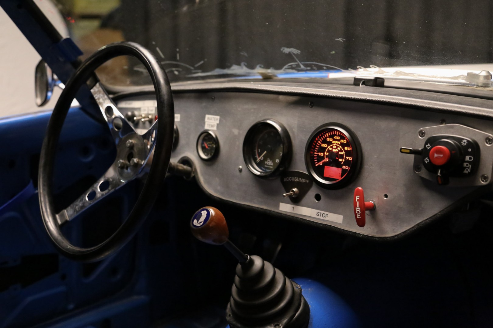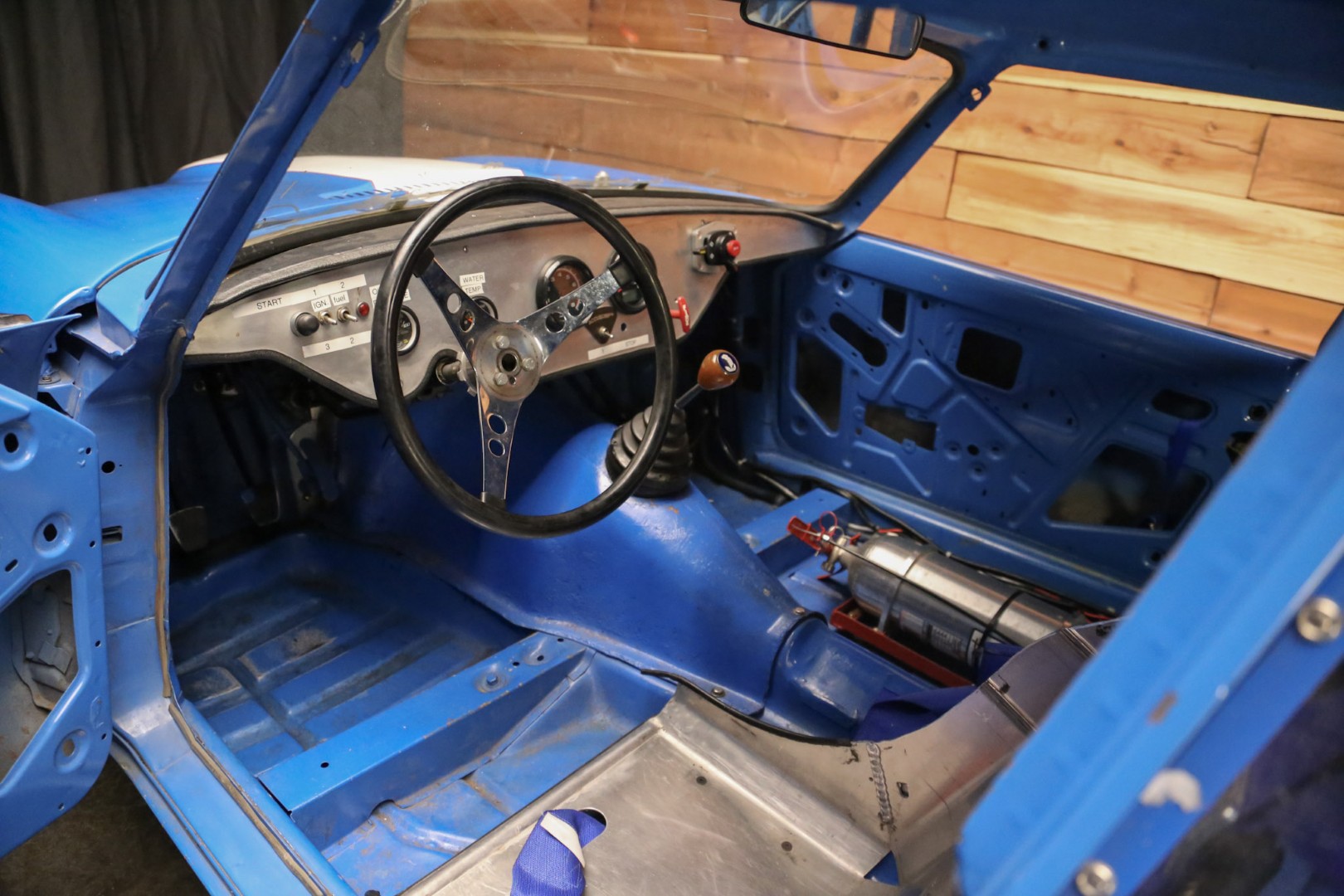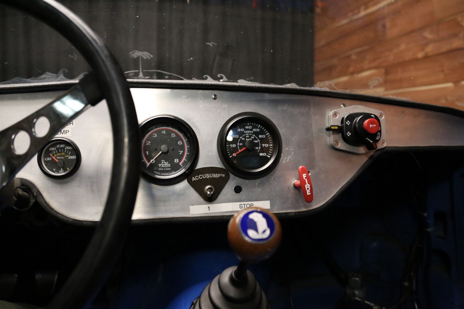 A brand-new fire suppression system is installed, with the suppression tank currently occupying the passenger seating area—this would need relocation if a passenger seat were added. The Accusump system occupies part of the passenger footwell but can also be relocated if desired. Five-point racing harnesses are installed and valid through 2025.