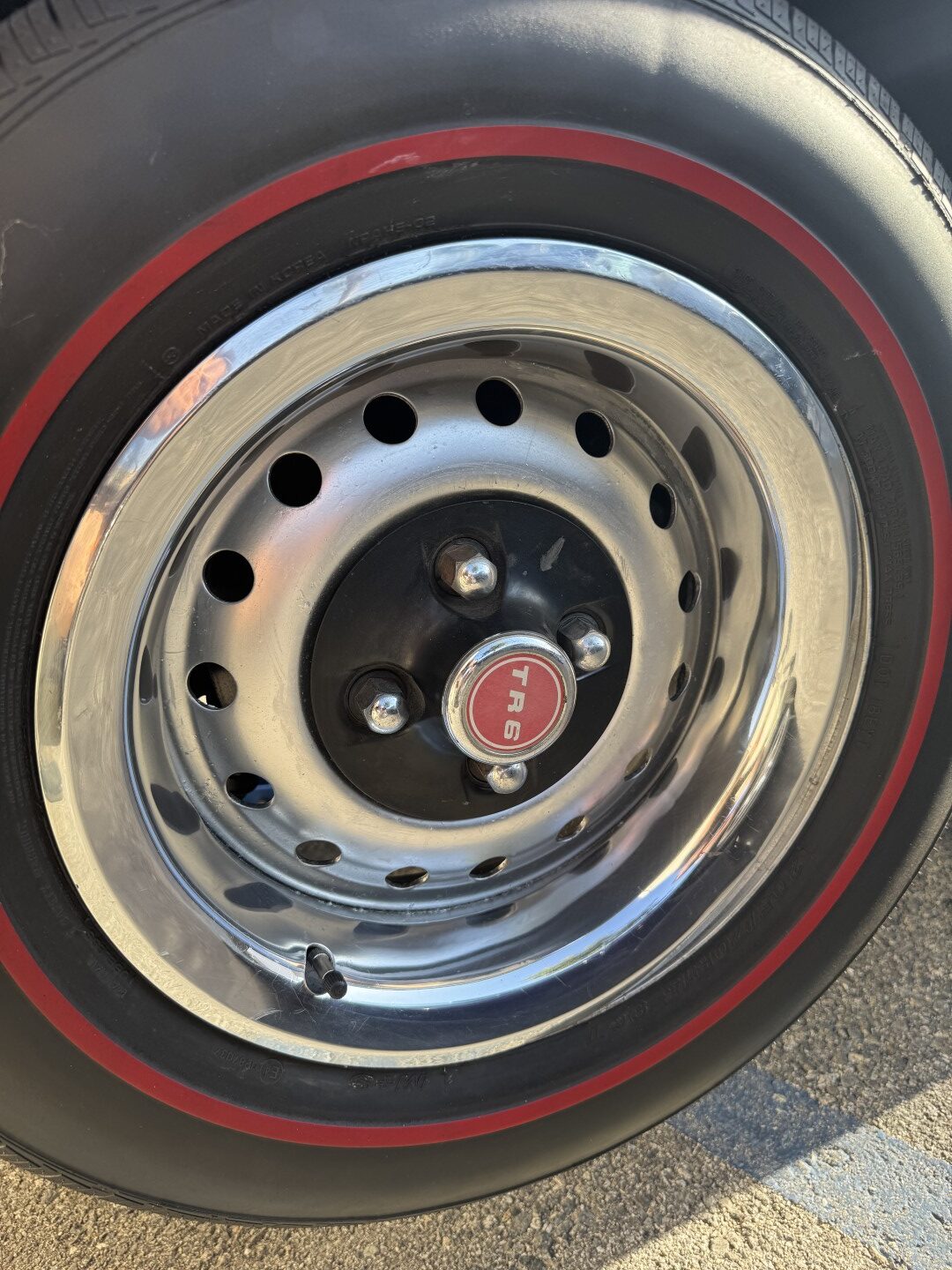The wheels have been nicely restored, with excellent paint and chromework. Period-correct Redline tires — new — complete a correct and handsome period appearance.