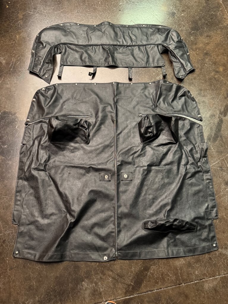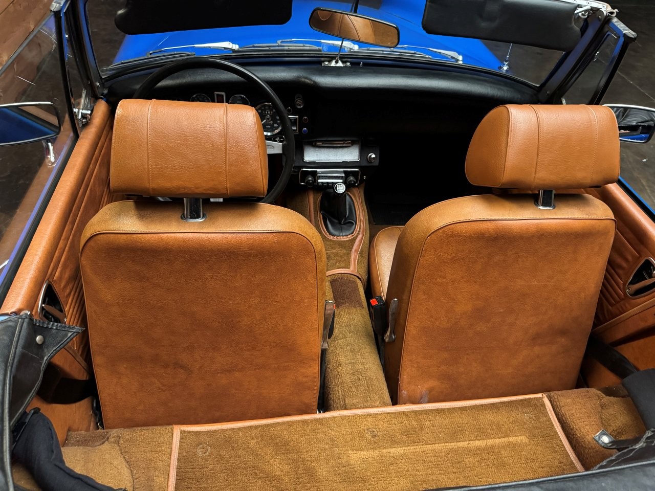 The interior is remarkably well-preserved, with the original upholstery free from rips, tears, or stains. The black convertible soft top is in good, usable condition, showing only light clouding in the plastic windows. Additional features include a black tonneau cover, boot cover, original AM/FM radio, dash, keys, shift knob, owner’s manual, jack, lug wrench, and tool bag.