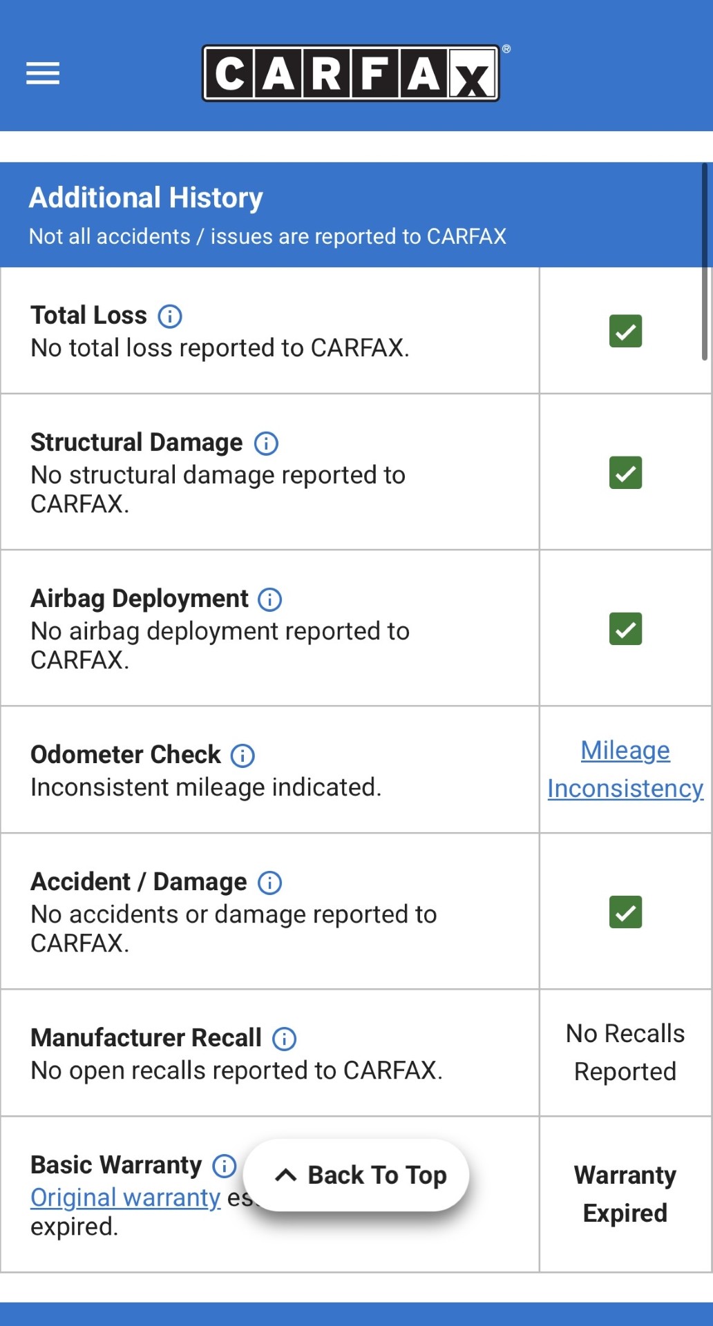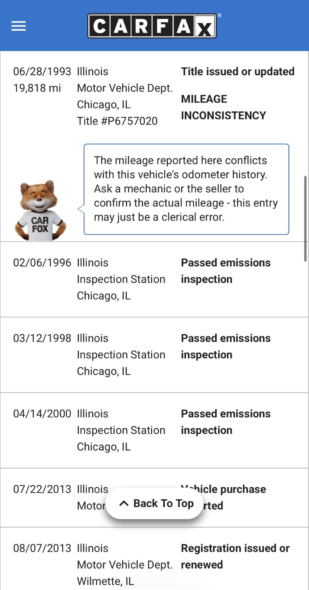 Additionally, the Carfax report notes a “mileage inconsistency” in 1993, which is clearly a clerical entry error. The mileage records before and after that entry track appropriately and support the documented low mileage of the car.